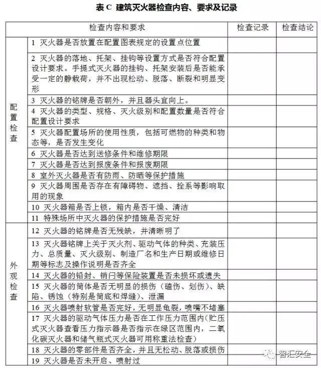 1、灭火器的配置、外观等应按附录C的要求每月进行一次检查。